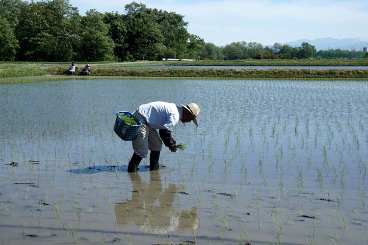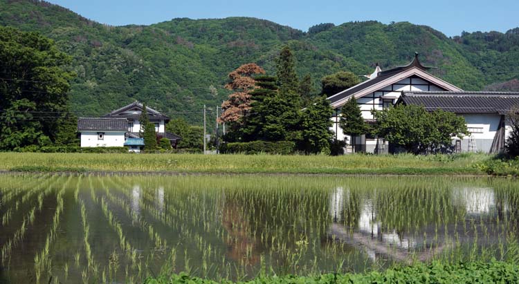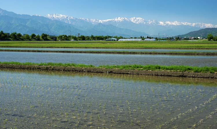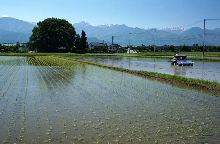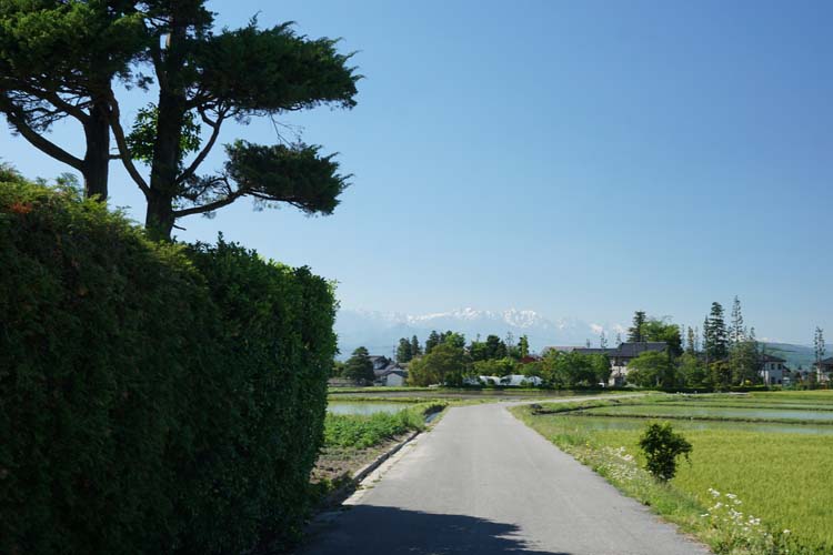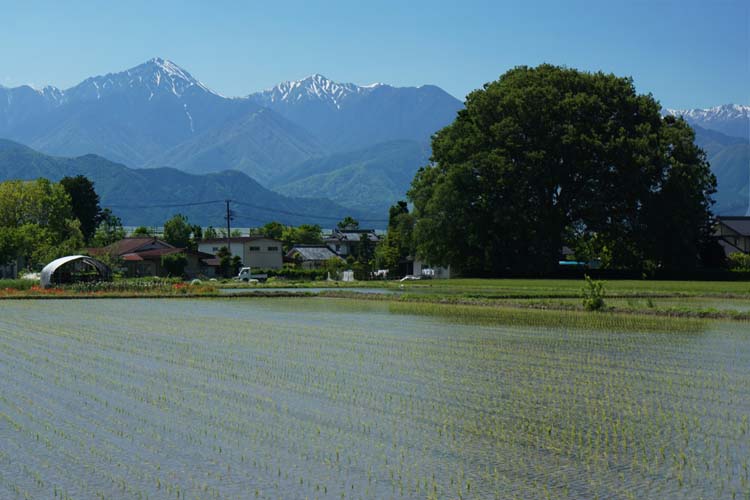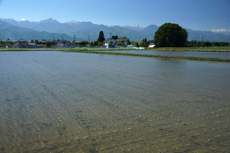 | 臼井吉見の大作「安曇野」には、有明、常念、爺などの山々の残雪、見渡すかぎり埋めつくす紫雲英(れんげ)の花、そこここにちらほらする土蔵の白壁、そして水辺の榛の林がたびたび登場する。その、れんげの季節に歩きたかったのだが間に合わなかった。しかし、残雪の山々が安曇野の田植の風景をこの上なく美しく引きたてていた。 |