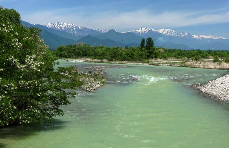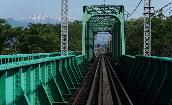| 穂高駅、有明駅間の大糸線踏切からの穂高川橋梁 |