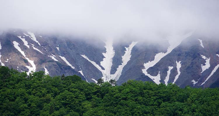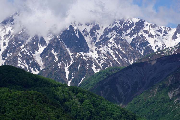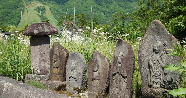 アルプスの清冽な残雪風景と 石仏・石塔の世界が繰り返し現れる。 別世界である