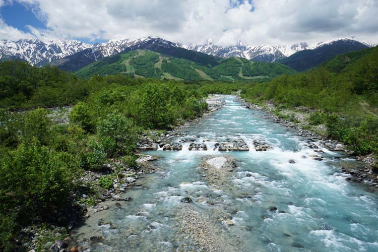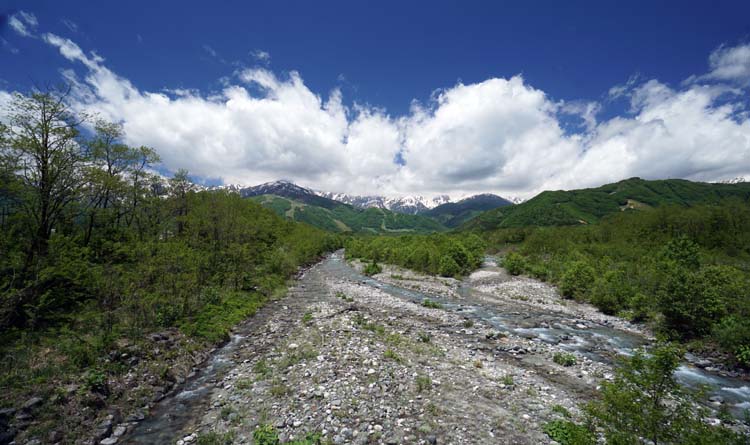 松川橋からの松川 この上流で二つの沢に分かれ、一方は白馬岳、もう一方は白馬鑓ヶ岳、唐松岳に源を発している
