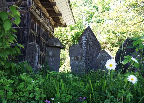 | 左:「右 えちご 左 やま道」の道標 右:庚申塔(青面金剛、雲、月、邪鬼、雌雄の鶏、三猿あり) |