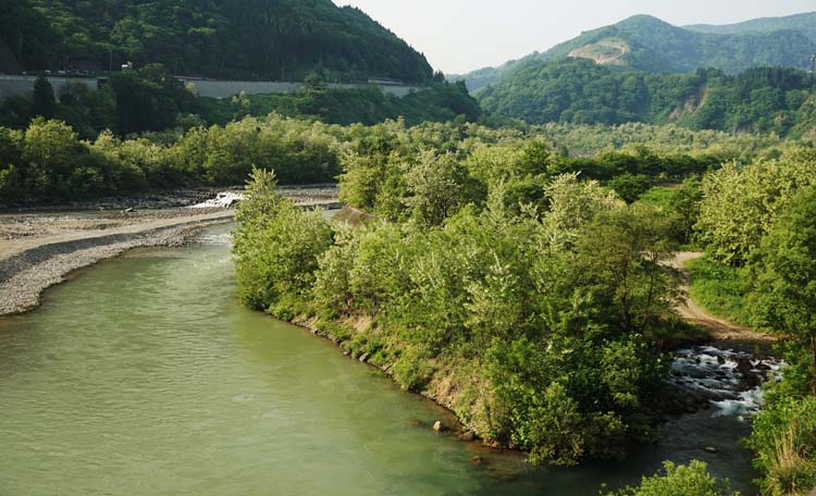 姫川に広がる来馬河原。 かつての来馬村の家並みや田畑が稗田山大崩落で壊滅して河原の下に沈んだ