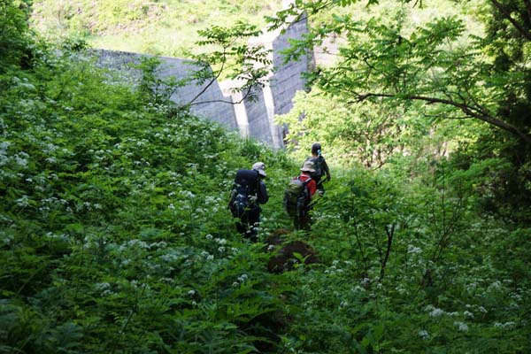 砂防ダム近くを行く、埼玉などの登山仲間グループ 道は殆ど草に隠れて見えない