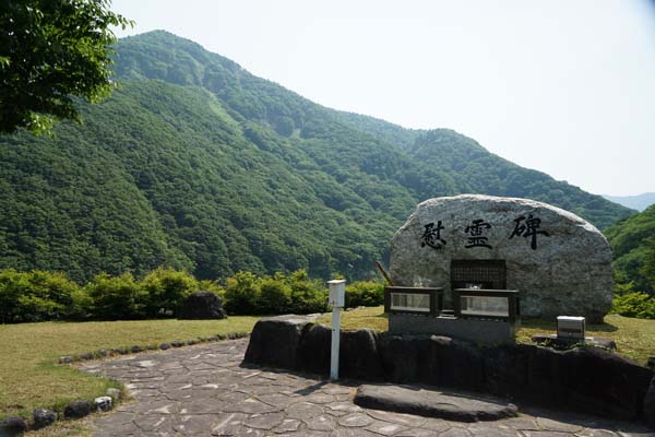 蒲原沢に近く、約500年前と約1000年前の大地震で大地すべりを起こした真那板山と姫川を望む広場にある。
