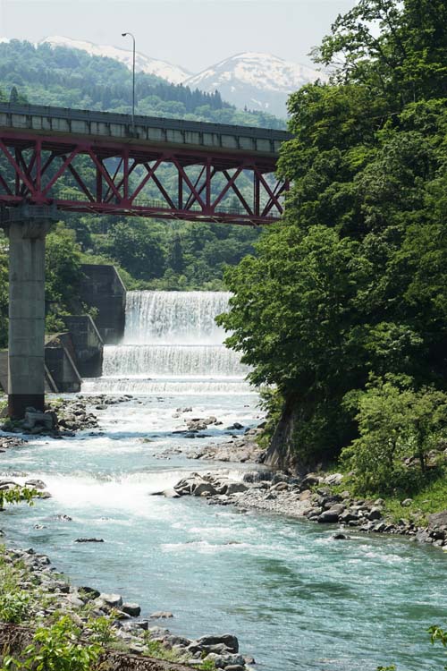 | 平岩駅前にも砂防ダムを越える激しい水の流れがある |