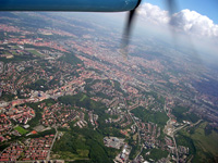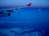 | ボヘミアの空は、南のオーストリア、西のフランスやドイツの空と変わるところはなかった。 ゴッホが若いときに描いた雲、シスレーの川の上に広がる雲。 ヨーロッパに来ると、絵と同じ雲だと、いつも思う。 さほど大きくない塊が、折り重なりながら、刻々形を変えて、流れてゆく。 イギリスの空は違うというが、そう違わないように思う。 次々に流れて行く雲の行方を眺めていると、感慨を覚える。 いまや、国境の線は細くなり、雲のように、人も物も、容易に越えられるようになったのだ、と。 ボヘミアの貴族、クーデンホーフ・カレルギー伯爵夫人(青山)ミツコの次男、リヒャルト・ニコラウス・フォン・クーデンホーフ・カレルギーによる「汎ヨーロッパ論」が、大きなインパクトを与えて、EU設立の基本理念となったと聞いた。 氏の故郷であるチェコも昨年2004年5月にEUに加盟した。 旧社会主義体制の国々までも、次々にEUに加盟する様子を見て、新しい、平和な時代が本当に来たのだ、と実感する。 しかし、思えば、古代ローマ帝国や、後の神聖ローマ帝国を経てきたヨーロッパである。 神聖ローマ帝国のころは、貴族、領主たちがもっぱら自分のために、激しく繰り返した勢力争いの時代であっただろうが、本来は、地域の独自性を前提に、共通の利益と安定、そして平和の確保のための共同体をめざすことが、少なくとも表向きの目標であったはずある。 古代ローマ帝国の繁栄期には、それが実現していたといい、神聖ローマ帝国は、そうしたローマ帝国を再現することが願いだったらしい。 新しいEUの根底を流れる精神は、こうした2000年以上の時代の流れの間に熟成されてきたものではないか。 今、「支配者」と「被支配者」の関係、「搾取する側」と「される側」の関係ではなくなったことが、昔との、画期的で、決定的な違いであろうが。 ボヘミアへの別れはプラハからウイーンに戻るプロペラ機からだった。 DHC-8(-400)で2000年に運用が始まったボンヴァルディア社(旧、デハビランド・カナダ社)製の新型機である(上左の写真)。 窓から、プラハが赤瓦の町であることを改めて確認できた。(上の中央の写真をクリックすると、上空からのプラハの町が拡大されます。カレル橋やプラハ城がかろうじて見えます) そして、ボヘミアとモラヴィアの田園風景を目に焼き付けた。 ウイーンから東京への帰国はちょうど、夏至の日にあたった。 しばらく飛ぶと、左側の窓越しに陽が沈む。 その後、落日からかなり時間が経っても残照が消える気配がない。 やがて深夜とおぼしき時刻になると、シベリア上空である。 南側である右窓から満月が見える。 地上には、明かりがポツリポツリと、数個見えるだけである(上右の写真、翼先端部にあるのが月、下の方にある小さな光がシベリアの明かり)。 月の光を受けた雲とともに、なかなか幻想的な景色である。 左側、すなわち北側には、まだ、残照がある。 眠れぬままに、観察を続ける。 すると、残照が、そのまま朝焼けに変わってくるではないか。 どうやら、コースは北極からはかなり離れているが、白夜かそれに近い状態の中を飛んでいるようである。 月と同時に、夕日と朝日をわずかな時間帯の中で見ていることになる。 地球が小さく感じられる景色である。 |