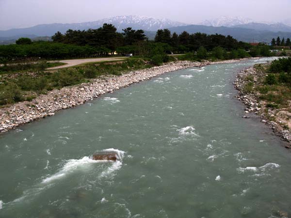| 毛勝山 黒部市の北陸道が黒瀬川を渡る地点から |