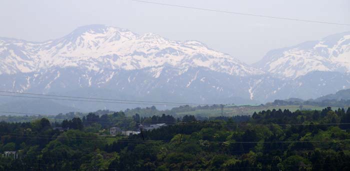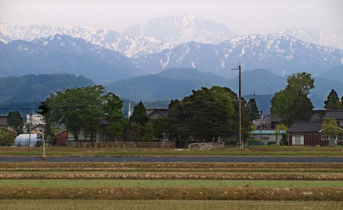 | 左に朝日岳、 中央に小蓮華岳、鉢ヶ岳 右に白馬岳、旭岳、一番高く見えるのが清水岳 宇奈月町浦山付近の旧北陸道より |