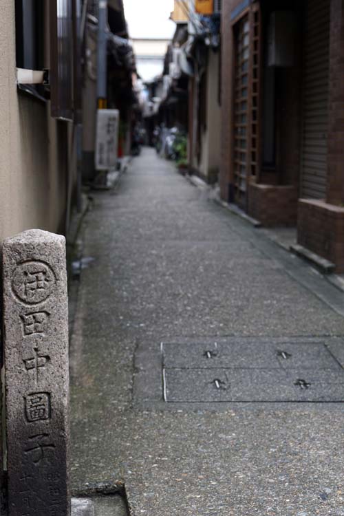 | 膏薬図子(こうやくのずし) 将門の霊を供養する空也上人の「くうや」が「こうやく」と訛ったと伝えられる 京都にはたくさんの路地(「ろーじ」)がある。「図子(ずし)と呼ぶこともあり、 「路地」は行き止まりの道、「図子」は通り抜けられる道、と使い分けられることもあるようだ。 |