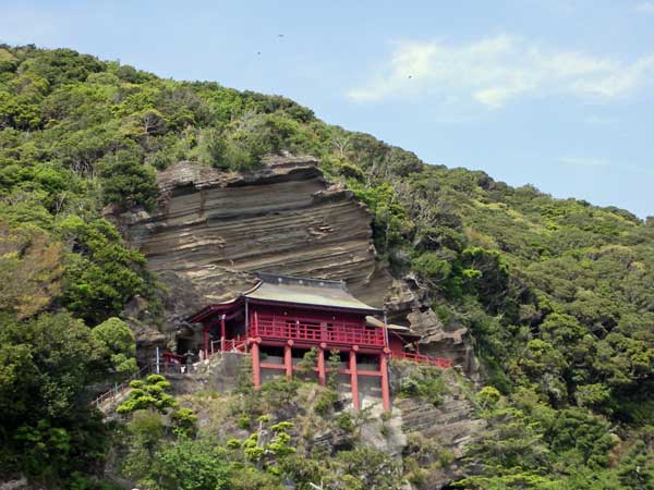 新緑の美しい山を見上げながら歩いていたら、突然出現。 後で調べた。 養老7年( 723年)、東国巡訪中の行基がこの崖面に十一面観音を彫刻安置したのが寺の始まりとされ、観音堂背後に高さ 1.5mの磨崖十一面観音像があり、館山市の有形文化財に指定されている。観音堂は飛騨匠の作と伝えられる朱塗舞台造とか。 荒々しい岩肌との対照が印象的である。(出展: