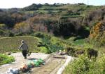 | 畑は今、ほとんどが三浦大根である。 だが、農家のおばさんに声をかけられて、採れたてのキャベツをいただいた。 二人のザックにひとつずつ入れて、台地の恵みを背負って三崎港まで歩いた。 港では地元の海の幸を味わった。 |