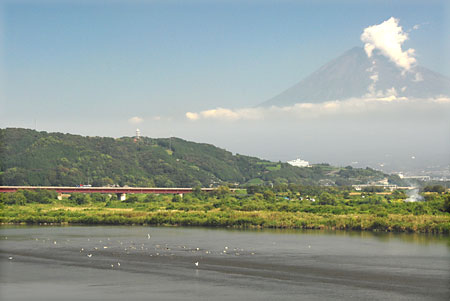 | 吉原宿で、暑さを避けて長逗留しているあいだに、弥次さん、喜多さんに追い越されてしまった。 二人は、ちょうど今、お伊勢さんに到着するところである。 広重の描く五十三次に加えて、東海道中膝栗毛を旅の友に加えることにしたのだ。 脚注に頼りながらの原文読みはいささかしんどいが、二人が繰り広げる珍事や騒動から、東海道を歩く人々、そこに住む人々や宿場の様子が生き生きと浮かんでくる。 十辺舎一九が前書きに書いているように、五十三次の名所旧跡の説明は一切ない。 ただし、古典を引用した狂歌や駄洒落が頻繁に飛び出して、二人の博識ぶりがうかがえる。 蒲原の宿では、喜多(北)さんが、深夜、木賃宿に同宿の巡礼の若い女を追って二階に上がり、その女の床と思ってもぐりこんだのが、実は、連れのおばあさんの床で、あわてて逃げるときに、竹すのこを踏み抜いて下に落ちてしまい、大騒ぎになるのである。 ![]() 9月も彼岸を迎えてやっと涼しくなり、吉原宿から再び歩き始めた。 これまで暑さ対策から好天を避けてきたために、せっかく富士山のふもとを歩きながら、その姿を仰ぐことができなかった。 今回から、できるだけ好天を選ぶことにしら、さっそく美しい富士を楽しむことができた。 美しい秋の空である。 広重が由比宿として、田子の浦越しの富士を描いた場所として有名で、今は眼下に東海道線、国道1号線、東名高速道がもつれ合う景色が名物となった薩埵峠越えが、今日のハイライトである。 |