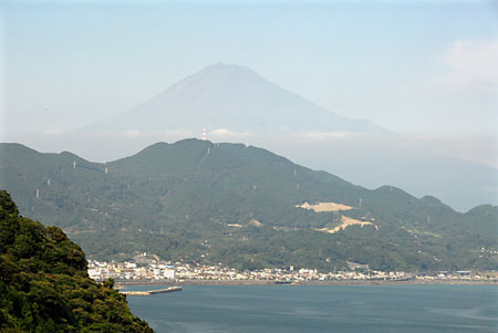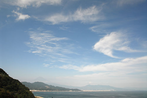 旧東海道を歩くことを決めた理由の一つがここにある。薩埵峠である。 その峠への登り口に一里塚跡がある。その小さな石の標識の横に沢山の杖が置かれている。どうぞご自由にお使い下さい、という意味だと思う。さほどの高さではないので、その好意を無視して登り始めた。 ところが、またまた足がつってしまった。今回は右足のすねの下部である。友人からの忠告を得て、今回はお茶ではなく、スポーツ飲料を飲んでいたのだがダメだった。 と思ったとたんに思い出した。 もう一人の友人から勧められて、別の機会に効果を実感したはずの、アミノ酸系サプリメントを飲むこと、持ってくること忘れていたのだ。 明日、清水や静岡を通過するときに買い求めることにしよう。 峠からの眺めはさすがに見事である。朝から見えていた富士山が、峠を通る午後まで姿を隠さずに待ってくれているかどうか心配だったが、この通りである。 広重が描いた場所である。 道路など人工的な構造物はふつうなら景色の邪魔ものであるが、ここではこの曲線が不思議で面白い景観を作っているのである。 |