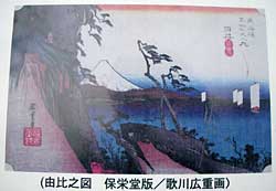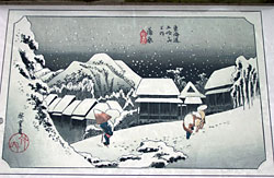 広重の蒲原宿は、雪景色である。 昔から蒲原ではこのように雪が積もることはないという。 広重は東海道を通ったことがない、という説の根拠として取り上げられる絵のひとつだが、むしろ広重の五十三次の中での最高傑作であるとの評価が一般的である。 詩情にあふれ、見ていて胸が熱くなる作品である。 広重が描いたと思われる場所に、「蒲原夜の雪」のレリーフが立っている。左の写真は、その銅版を写したものである |