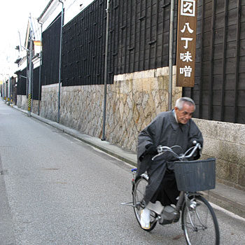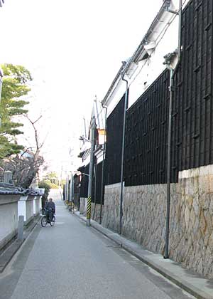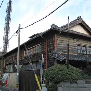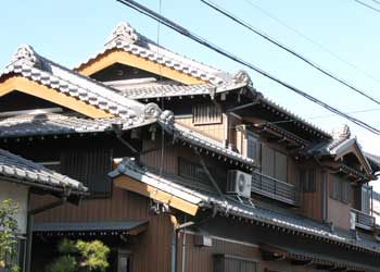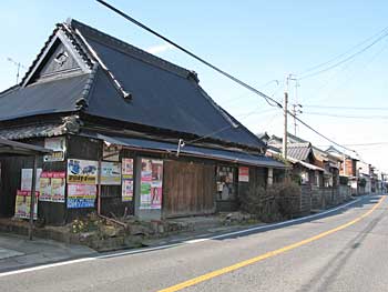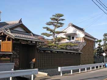 屋根瓦が立派である。 「瓦を載せるために家があるのだ」と主張しているように見えるほど堂々としている。 三州瓦の本場である。 このあたりの旧東海道沿いに新建材の屋根は殆んど見当たらない。 たとえ外壁が新建材であっても、幾重にも重なるように見える屋根には、黒瓦を載せている。 黒瓦だけの町並は、見渡すとたいへん迫力がある。 三州瓦は、三河地方の土を使って焼いた、釉薬つきの瓦である。 半ツヤとでもいうのだろうか、釉薬がかかっていてもぎらぎらではない。 今や、東には少なくなった板壁もかなり残っていて、この黒瓦とのコンビが美しい。