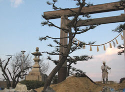 右の東海道を行く旅人は、ここにある伊勢神宮ニの鳥居から遥拝したという。 伝統にならって、鳥居の下で頭を下げた