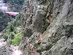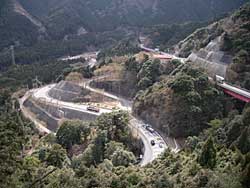 鏡岩から恐る恐る下を覗くと、国道1号線を鈴鹿トンネルに向けて次々にトラックが登っていた