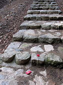 峠から120mほど横道に入ると鏡岩がある。 盗賊が峠を登る旅人をこの岩に映して襲ったというのだが、温暖化や酸性雨で岩の表面が凸凹になったのか?!