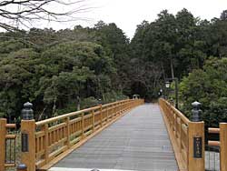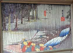 冷たい強風にたじろぎながら、合流した1号線をしばらく進み、再度旧道に出るとガイドブックには「今はない」と記されていた田村神社横の橋(街道橋)が復元されていた。 昨年完成したばかりだそうだ。 この橋が、広重保永堂版の土山宿の図「土山春之雨)に描かれた橋である。