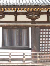 東大寺三月堂 連子窓に並べた連子子(れんじこ)は方形の木である。 四角の断面を45度まわして取り付けられている、飛鳥時代から続く形という。