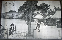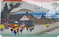 菜飯田楽発祥の地の元伊勢屋を描いたという保永堂版の広重、石部の図である。 もうすぐ草津、琵琶湖である