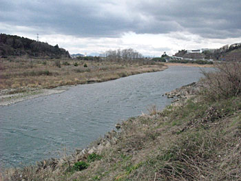 野洲川。 この先が琵琶湖である。 ここにかつて横田の渡しがあった。 遠くに見えるのは比叡山らしい
