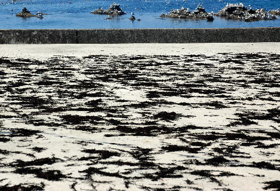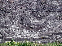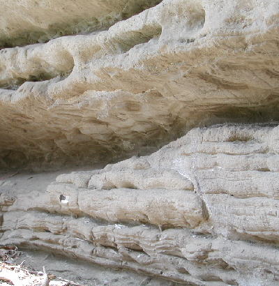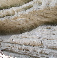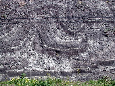 左は、三浦市海外町(カイトチョウ)の海岸近くにあるスランプ構造の地層です。 城ヶ島のものに比べるとかなり大きな規模です。 右は、もう少し南に下った白石町にある漣痕(リップルマークです) いずれも城ヶ島のページ(Click)をご参照下さい。 |