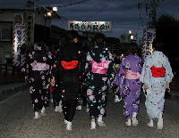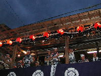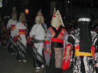 | 夜がふけていつの間にか踊りの列から子ども達が消えていた。 別世界になっていた。 お囃子もがんけ(甚句)に変わり、哀調が漂って踊りの列も流麗な動きになっていた。 すっかり引き込まれていた。 そして、どんどん時間が過ぎて、立ち去りがたい思い、もっと浸っていたい思いを振り切って本町通りを離れざるを得ない時刻になってしまった。 |