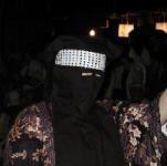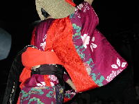| 妖艶な雰囲気はこのひこさ頭巾と端縫い衣装の美しい対照がかもし出しているようだ。 この端縫い衣装は、母や祖母の思い出のつまった絹の小布や半端な布を捨てずに、思い思いに縫い上げたもので、代々受け継がれているという。 8月の第1日曜日には、この西馬音内盆踊りに使う衣装を持つ家々が一斉に藍染と端縫いの衣装を展示して、町がひとつの美術館のようになるそうだ。 端縫い衣装の図柄と配色は伝統的な美しさだけでなく、ハッとするようなモダンとも云える新鮮さを持っている。 かがり火に映える端縫い衣装は、この妖艶な踊りに似つかわしくないほど賑やかで勇ましい野性的なお囃子ともモダンな対照の美を表しているようだ。 | ||||||||