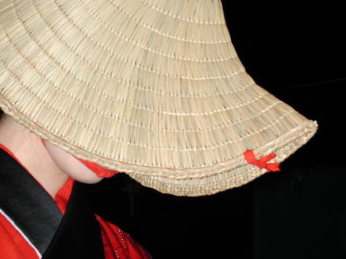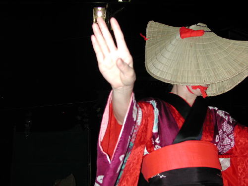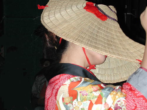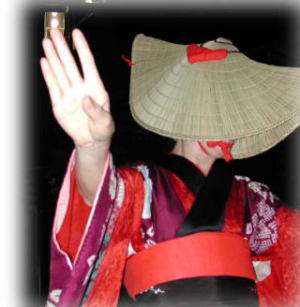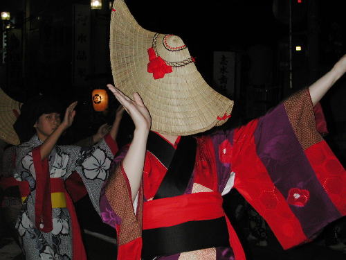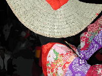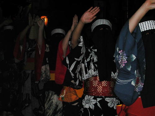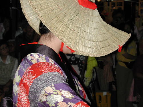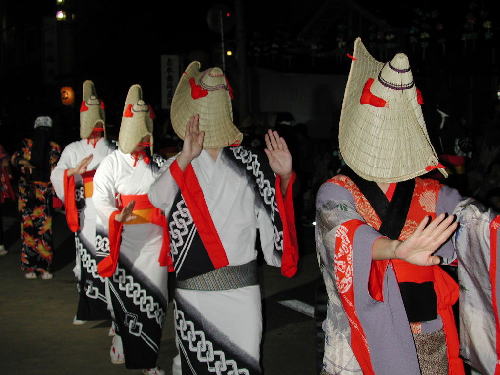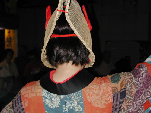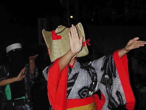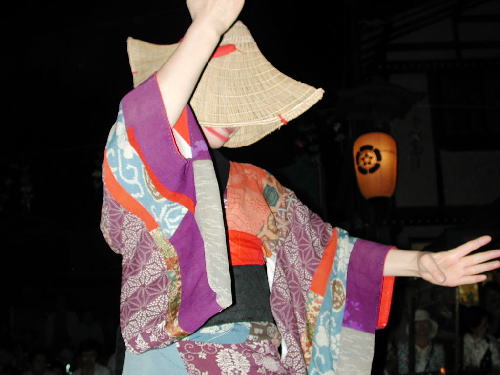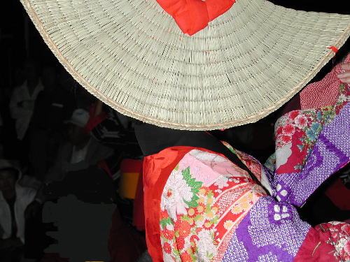 | 日が落ちていよいよ始まる。かがり火が勢いよく燃える。 お囃子は音頭に変わった。 編み笠姿の踊り手がひこさ(彦三)頭巾姿の若い女性を率いて踊っている。 親御さんが付き添ったかわいい踊り手も多い。 音頭の歌詞は小さい子向けとはいえないユーモラスでエロティックな内容だ。 大きくなってから、耳にこびりついた歌の意味がわかって苦笑するのだろう。 次第に踊り手が増えてきた。 ひこさ頭巾姿だけでなく編み笠姿の踊り手も笠を深くかぶっているのでまったく顔を見ることが出来ない。 美人なのか、若いのかは、うなじや手指から推し量るしかない。 音頭やがんけ(甚句)の歌詞にも、このあたりの機微を楽しんだくだりがある。 女性の優美さを、顔かたちなどの要素をはずして、体や手の仕草と指先だけで表現する美しさを追求していって、このような衣装や笠のかぶり方を考え出したのだろうか。 風の盆では編み笠はこれほど深くかぶらなかったから、努力すれば美しい顔を覗くことが出来たのだが。 |
