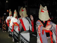 | そもそも、この西馬音内盆踊りの起源は定かではないが、豊年祈願と戦国末期に山形の最上氏に亡ぼされた西馬音内城主小野寺氏の供養の踊りが合体したものとの説が有力のようだ。 幻想的な黒い覆面のひこさ頭巾はこの供養のための亡者踊りの流れを残しているとも云われる。 | ||||||||