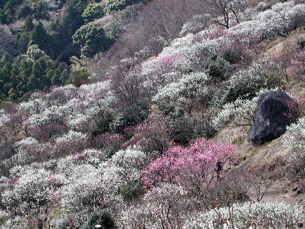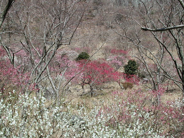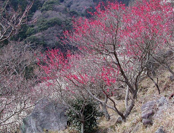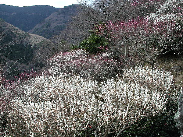 | 天気予報で3月中旬、下旬の暖かさになりそうと聞いてじっとしておられず、歩いてみることにしました。 梅の山に入る前に湯河原駅からまわり道をしていったん海岸に出ました。 春霞にけむる伊豆大島と初島の間に利島が浮かんでいました。 吉浜からいよいよ山側に向けてのぼりはじめると、相模湾を背景にみずみずしい夏みかんと紅梅、白梅、そしてところどころにはヒカンサクラや河津ザクラの明るいピンク、さらにはミモザの鮮やかな黄色と、まさに春爛漫といった趣でした。 バスの通らないこの山沿いの路をゆっくりと行き、やっと幕山公園にたどり着いたときには息を呑みました。 山の斜面をパステルのようなやわらかい色が埋めているのです。 秋の「錦」に対して、春のこの色模様をなんと表現したらよいのでしょう。 ちょっときつい傾斜ですが幕山の登山道を途中まで登って、上からのこの4000本の梅林を見下ろしたときの美しさを筆舌にあらわすことは難しいことです。 充分に表現できているとはとてもいえませんが下の写真をご覧ください。 帰りは、新崎川の反対側にあるバス通りを歩いて駅に戻りました。 この日のビールの味は格別でした。 |