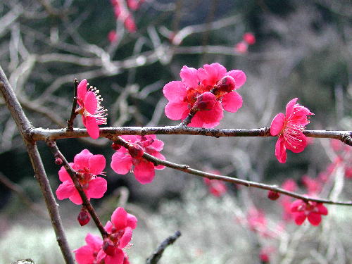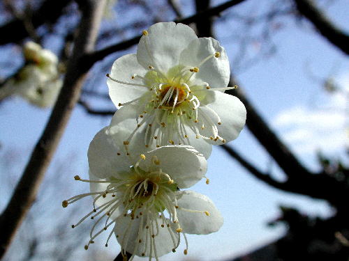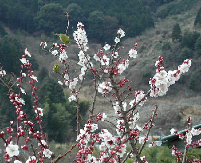 | 幕山に向かう路沿いの梅ノ木で蜜を吸うメジロたち |
