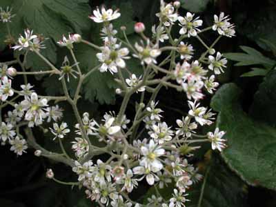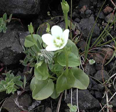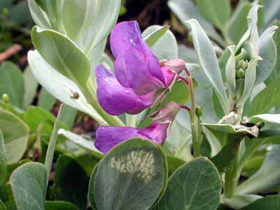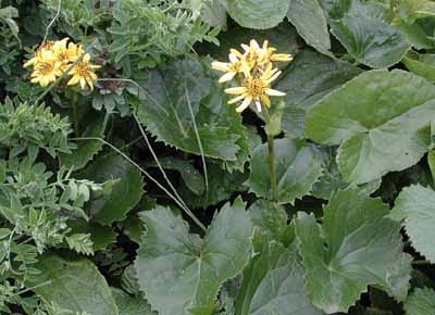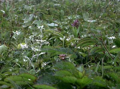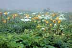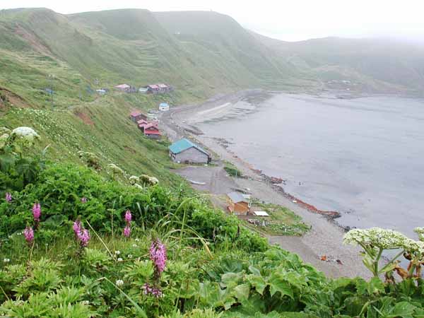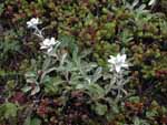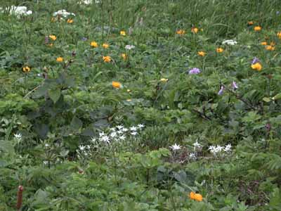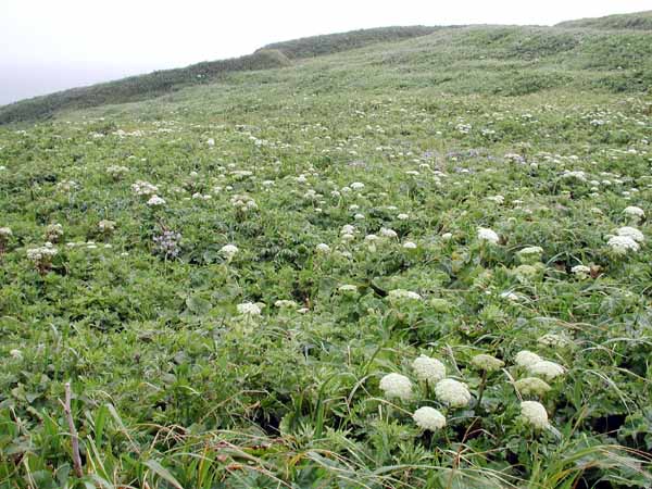 | 今回見た膨大な数の花の中で、結果的には、レブンウスユキソウが最も印象的であった。 普段あまり行かないところに行きましょうとの宮本さんの案内で登った群生地には、ガンコウランの見事な絨毯のなかに露に濡れて輝いていた姿は素晴らしかった。 アルプスのエーデルワイスだけでなく、今は植物園などでウスユキソウを見ることは決して難しくないが、自然のなかで毅然と咲く姿は感動的であった。霧に煙っていたこともその理由のひとつかもしれない。 なお、引き立て役のガンコウランを見たとき、苔だと思ったがそうではなく、なんと低木だそうである。 もちろん花々は実に見事であるが、心を打つのは人の生活がかかわる風景である。 低い丘が連なる独特の海岸の景色は海性段丘と分類されるそうだが、その丘と海岸の間にある建物には、冬場の厳しい環境を想像させたり、昔の記憶を呼び起こさせるような懐かしさを感じさせるものが多い。 3日目にスコトン岬を経て、鮑古丹からゴロタ山を歩いたとき、山や丘の稜線の美しさと、咲き乱れるお花畑と海がつながっている感のある見事な光景に息を呑んだが、その景色には、番屋ではないかと思われる建物が重要な位置を占めている。 その鮑古丹の海岸に降りると、その建物のごく質素なつくりの赤や青のトタンぶき屋根がこうした光景では不思議に調和しているような、安心感を与えてくれるような、それでいてまるで異なる次元へのゲートのような新鮮さを与えてくれる。 鮑古丹を象徴しているこの建物のすぐそばにはハマベンケイソウが宝石のように輝いていた。 ハマハコベと並べて寄せ植えしたかのような見事なコントラストを描いている。 |