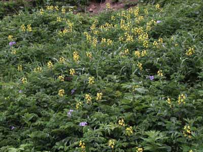 | 香深港からのバスが走り始めるとあっという間に花が咲き乱れる丘に入った。 ここでバスを止めてくれー、と言いたくなる景色である。 しかし、無常にもどんどん走ってしまう。 実はこのあと、そして翌日にもたっぷりとこの辺の草原を歩くことになるのだが。 | ||||||||||||||||||||||||||||