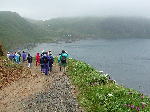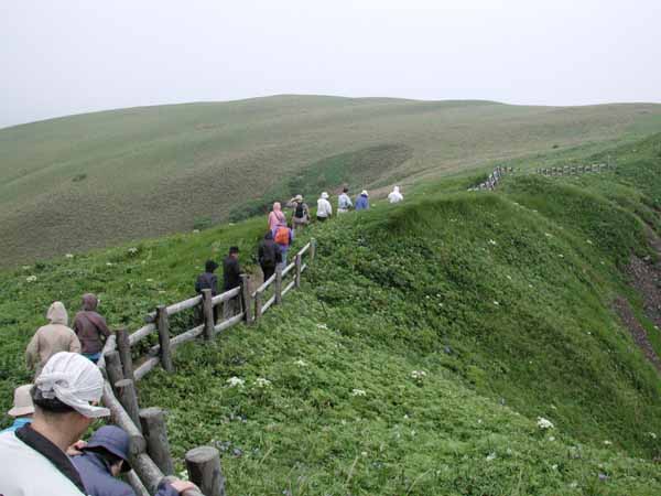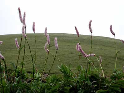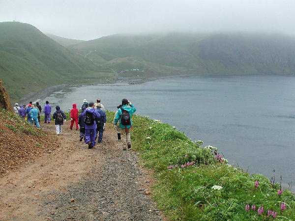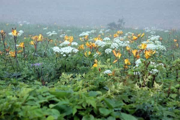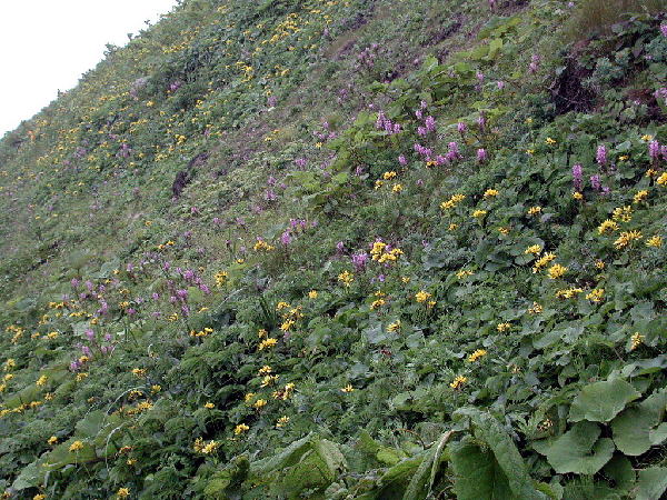 | この礼文島でどこにでも咲いている目立つ花はピンク色のレブンシオガマ(ヨツバシオガマ)であるし、宮本さんの強いお勧めは、意外にもレブンウスユキソウでもレブンアツモリソウでもなく、あふれんばかりに群生しているエゾカンゾウである。いたるところに咲いているし、特に崖に連なる草原や霧に霞む谷あいのエゾカンゾウの群れは見事である。 ところどころに紅色に目立つきれいな花がある。コウリンタンポポという帰化植物だそうだ。 サラダなどの食用に札幌の先生が植えたのが始まりで北海道中に広がってしまったのだそうだ。 観光客には好評だが、実は在来種への影響で困っているという。 駆除をしているが成果が上がらないそうだ。 今回見た礼文島の殆どの山は草原の丘という印象であるが、もともとは深い森に覆われていた部分の多かった時代があったという。 船泊付近の山を見ながら聞いた話であるが、いつの時代であったか昔々、大火があり、谷あいの樹木以外は燃えつきてしまったそうだ。 以後、植林をしても殆ど根付かないという。 現在でも植林の努力が続けられているがなかなか成功せず、植生の復旧に途方もない単位の年月がかかるという。 自然が壊れる、または変化する原因はいろいろあろうが、復旧させるためには大変なエネルギーと時間がかかることを実感する。 そういえば、尾瀬では入山するときに登山客は靴を洗浄することを求められると聞く。 また、伊豆大島に行ったときに知ったのだが、島外の車が入ることを嫌ってフェリーが今でも運行されていない。 植生の維持のためだけではないだろうが、住民の総意であると聞いた。 | ||||||||||||||||||||||||||||