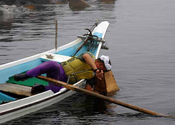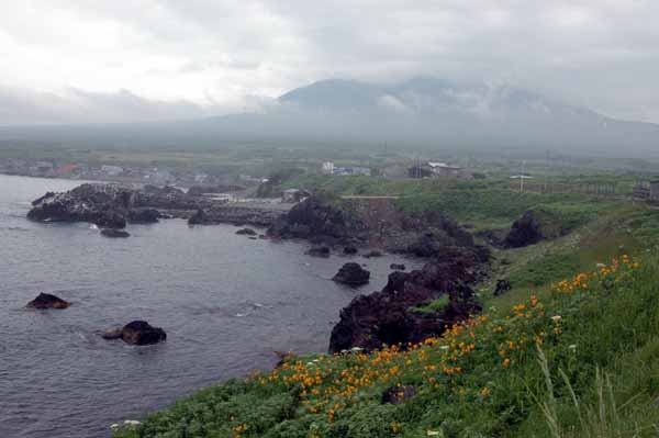 | 早朝5時45分、宿のご主人の案内でウニ漁を見に出かける。 晴れていれば逆さ利尻富士を見に姫沼に行くのだったが、頂上付近が曇っているために予定が変更になったのだ。 鴛泊港近くにあるユニークな形のペシ岬を見上げると、その中腹に赤旗が翻っている。 バフンウニ漁を知らせる旗だそうだ。 ムラサキウニのときは紫色の旗、昆布は黒旗らしい。 バフンウニの漁は風、波が穏やかなときの朝6時半までの6月中旬からのわずか2ヶ月間程度だそうだ。 気象条件のそろう日はさほど多くはないそうだ。 鏡のように穏やかな海面で漁をしている船は意外にも岸のすぐ近くである。 足で巧みに櫓をあやつって移動しながら、箱めがねをのぞきながらカギ付きの棒で採取している。 一隻に一人だ。 ウニのえさは利尻昆布である。 気がつくと我々の足元の浅い海面下のごろ石の間に大きなタコがいるではないか。 悠々と移動している。 ウニといいタコといい、すぐ手の届くところにいる。 | ||||||||||||||||||||||||||||||||||||||||||||