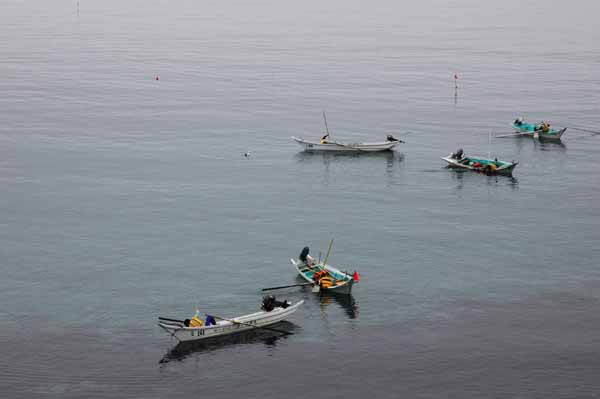 | 赤い旗がバフンウニの漁を知らせている 小さい写真上をクリックすると大きな画像が出ます |
