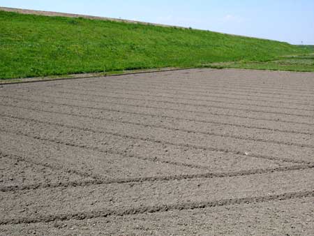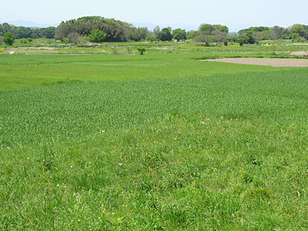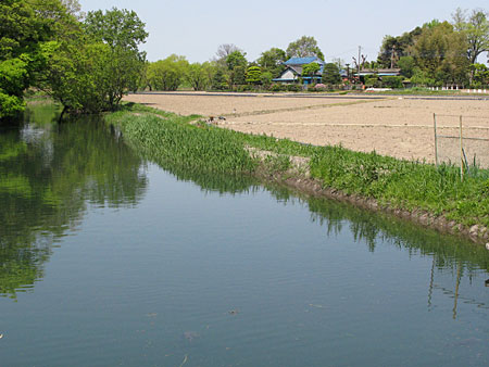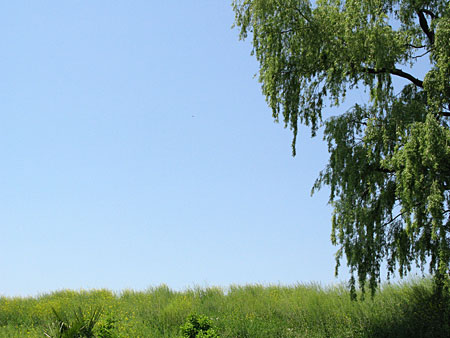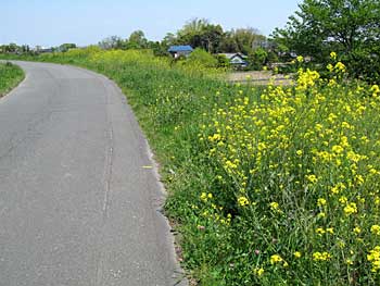 さらに吹上を過ぎて熊谷近づくと、広大な緑の世界が一気に登場した。 荒川の堤防、熊谷堤である。 川面がまったくみえない河川敷が秩父の山めがけて広がっているのだ。 大きな空の下で、この上ない清々しさであり、草の上に寝転がって過ごしてみたくなるのどかさである。 美しいこの季節の、とびっきり美しい中山道である。
