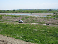 この熊谷堤は、天正二年(1574)洪水防止のために北条氏邦によって築かれ、その後、忍藩が修築したという。 しかし、近代的な堤防が出来た後の昭和22年9月、キャスリーン台風によって、ここで決壊し、この付近のみならず東京まで大被害を及ぼした。 決壊した場所に碑が立っている。 のどかなこの地にかつて地獄の場面もあったのである。