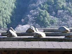 木曽11宿の最初は贄川宿である。 map を見ていただきたいが、中央本線贄川駅の近くに贄川関所跡がある。 江戸時代からは尾張藩直轄の関所となって、壬戌紀行では「駅を離れて小高き所に番所あり、尾張より番をすゑて曲物の器を改むるといふ」と書かれ、女あらためとともに、檜の加工品の密持ち出しを取り締まったらしい。 下の写真の石を置いた屋根はその関所跡を復元したものである。