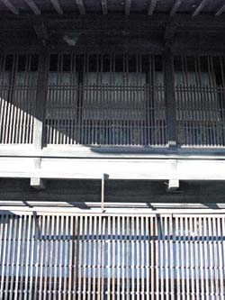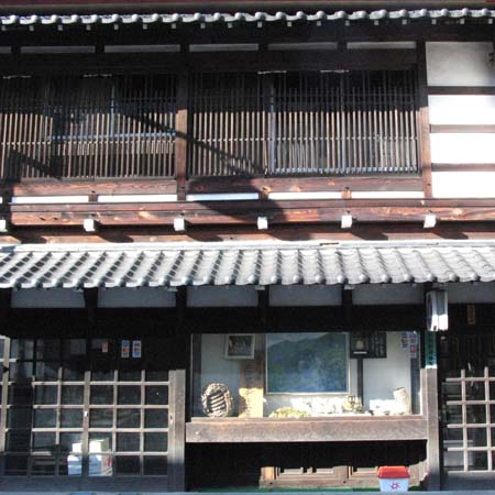 下諏訪で気になった格子のことを奥さんに聞いてみた。 この奈良井では、千本格子が有名であるが、格子は単に「格子」だそうだ。 今、奈良井宿の街道沿いではで、どこの家にも付いている格子だが、この格子が取り入れられるようになったのは明治に入ってからであり、昭和40年代でも、80%の家では「蔀戸(シトミド)」だったという。 開けるときには上に跳ね上げる板戸である。 奥さんのこの話から、翌朝、気をつけながら歩いたら、一軒だけその蔀戸の家を見つけた。 旧東海道の大津宿でも見かけた記憶があるが、似たような形であった。 京都の町家で流行った格子が、明治から大正、昭和にかけて農村や山村にまで広がったらしいことを、前に読んで知ったが、まさにその通りだったわけだ。