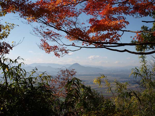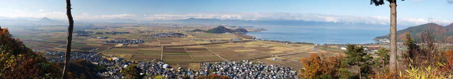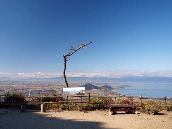 | 中山道歩きで初めて見た琵琶湖 枯木の真後ろに、遠く比叡山も見えている |