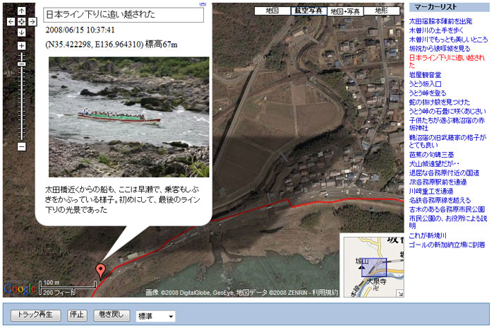 途中のマーカーの写真や説明を見る時には、いったん「停止」を押して動きを止めてから、マーカーをクリックしてください。 位置の調整は、地図上にマウスを置いて、クリックしたまま、任意の方向にドラッグしてください。 「トラック再生」をクリックすれば、引き続きその後が再生されます |