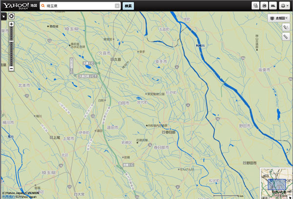 関東平野は巨大なお盆で、お盆のふちに当たる周囲の山地や三浦半島、房総半島南部では今も隆起し、たとえば関東大震災では三浦半島では1メートル以上も隆起したという。対して平野の中央部は沈下の傾向が続いているという。古代の地形図を見ると、6000年前の縄文のころは、栗橋付近まで海で、奥東京湾と呼ばれている。これは縄文海進と呼ばれる現象で、世界的に氷河が融けて海面が上昇したのである。ついでにいえば、その後、縄文後期には増えた海水の重みで、海底が沈んだため、再び海面が下がって現在に至ったそうである。お盆の底は、大昔は海だったわけである。 したがって、このお盆の底にあたる埼玉平野(と呼ぶらしい)は、低湿地で、地図を注意深く見ると、大きな川、小さな川、運河らしき堀、小さな湖沼がたくさんあることがわかる。今、農業用水などで活用されているが、かつての利根川、荒川などが、洪水のたびに流路を自在に変えて暴れた跡でもあるという。いったん暴れると、並行する多くの筋に、勝手に分かれて流れる、乱流が起こったのである。 旧日光道を歩いていても、ときおり橋を渡る程度であって、この、水が豊かな平野を実感することは難しい。道路や鉄道、そして地名の文字があふれているので、地図でもかなり見にくい。ヘリコプターで上空から眺めたいものであるが、思いついて、Yahoomap で、地図表示を「水域図」に変えてみた。春日部から幸手あたりを見たのが下図である。利根川(右)や江戸川(その左)のほか、数多くの小さな流れが走っていることがよくわかる。確かに、水の平野である。旧日光道中は、この奥東京湾跡の真っただ中を、北上している。