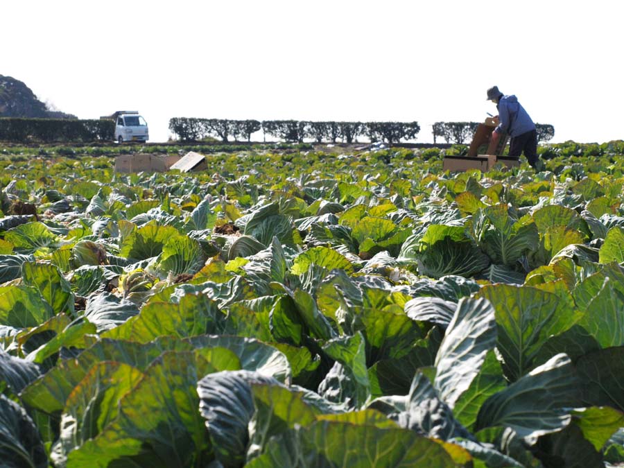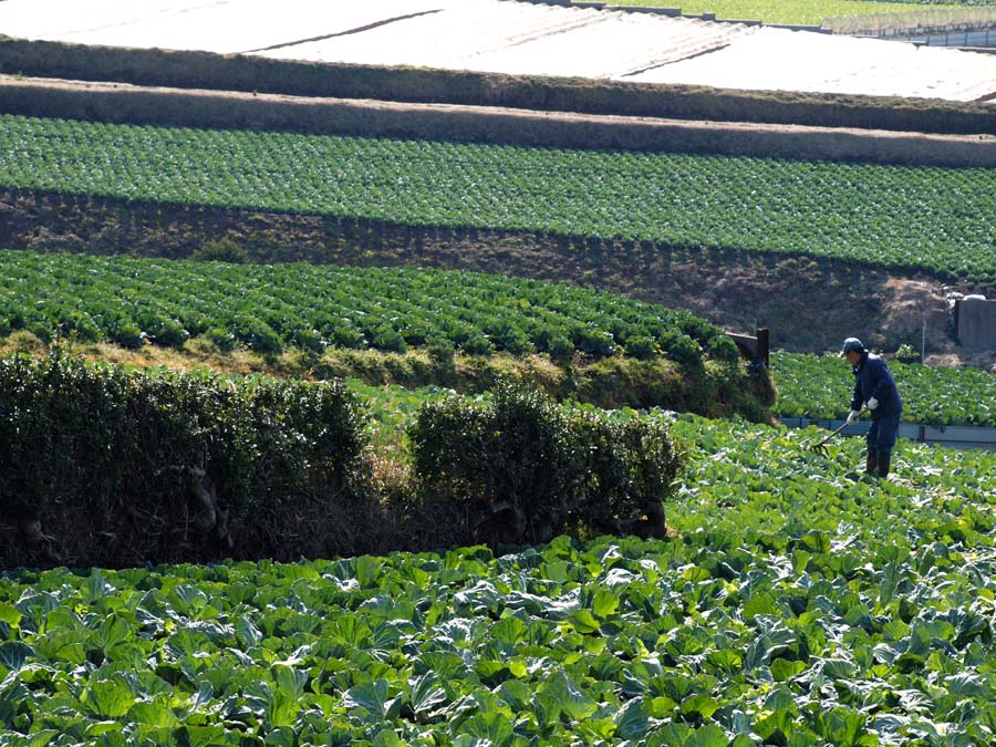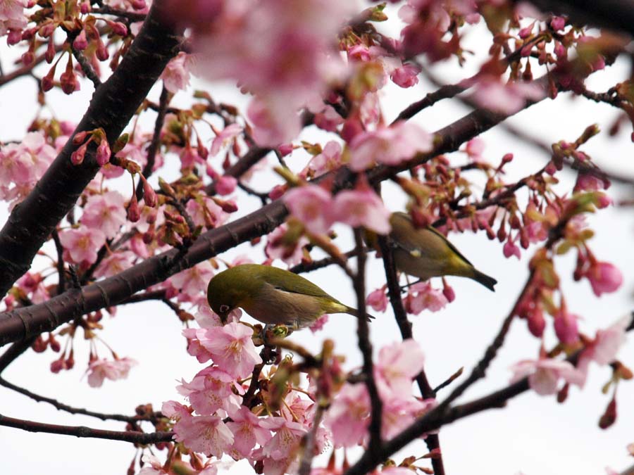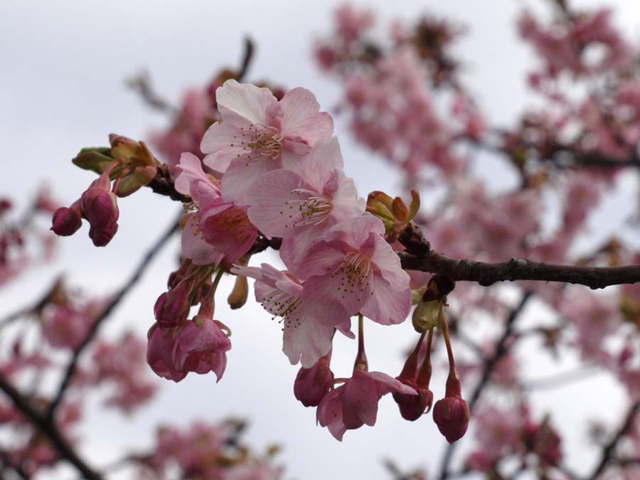 畑の緑が焼きついた眼に、河津桜のピンクが強烈だった まだ三分咲きほどだが