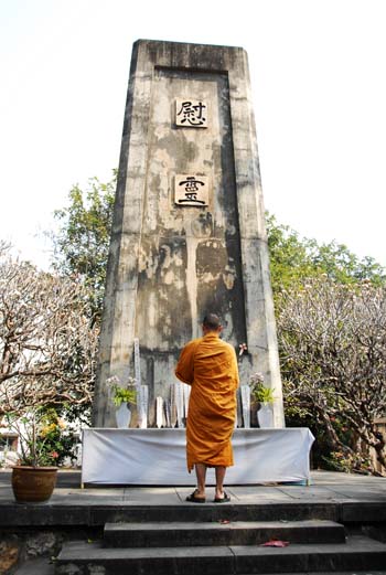 泰緬鉄道に乗って、あのクワイ河マーチで有名になった「戦場に架ける橋」を渡り、その橋や鉄道の建設に動員されて亡くなった、近隣諸国の労務者そして連合軍俘虜のために軍が建てた慰霊碑や連合軍墓地にもお参りしてきた。高野山のお坊さん、Kさんは、この慰霊碑で、般若心経と真言宗のお経をあげて祈った。