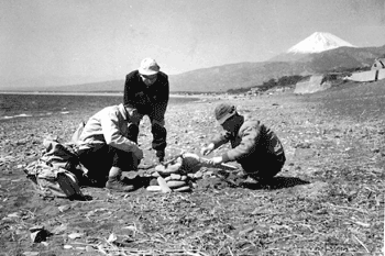 | 今日の地図 7:00 ここもやはりサイレンが鳴った。 一応みんなを起しておいて自分は起きない。 この間からずーとそうしてる。 いい気持ちだ。 遅れて起きても食事をするのは同時だ。 今日は自分の足のためダルマ山を断念。 一日早く船で沼津にむかう。 出発前一番強行軍を主調した自分が・・・。その自分のためダルマ山を断念するとは。 ともかく、女中さん(*1)の勧めもあって船で沼津に行くことは確実らしい(*2)。 9:45 出発。 500円にしては最高の部屋と思ってもいいだろう部屋に別れをつげ出発。 今日も足が痛い。 10:10 少しおくれた船に乗る。 すいている。 少し高い所にすわる。 テープで形だけ別れを惜しむ。 番頭はんとお客はん。 日本人ここにあり。 紙切れに情はない。 あとは物理的現象で、どこで切れるかが問題だけ。 それも切れて、土肥温泉も小さくかすむ頃船の前方へと出て見る。寒い。 けれども富士が見えるまでは立つ。 今日はすばらしい天気だ。(当番は僕だ。やっぱり・・・)南アルプスの山々が見える。 北アルプスであるか南アルプスであるか、しばし論争。寒さはきびしい。 リップをなめると塩からい。 それでも立つ(*3)。 海はやはり青い。 建設中の新道路がはるか山の中腹に見える。 岩に波があたって、くだけて、白い。 見えた。 富士が左側からゆっくり、ゆっくり見えてくる。 いつ見ても美しい。 完成された美しさ。(*4)船はかまわず進む。 富士が完全に見えたところで各自思い思いのポーズで写真をとる。 みんないやにすます。 どんな顔をしてみてもつまらん顔(*5)だということを知らないのだろうか。 “鏡を見ろ”と言いたい。でも“知らぬが仏” あの顔でみんなカメラにおさまっちゃった。 やがて戸田港へとよるため船は大きく右へと回る。 11:00 戸田発。 本当の今日の目標ダルマ山が高く遠くに見える、美しい山だ。 あの山に登るのを、ただ、僕の足のためにみんなが断念した(*6)のかと思うと、ただ残念だ。 しばし遠ざかりゆくダルマ山とみじめな自分の足を見くらべて声もなし。 “諸君許せ”今度はきっと他人に迷惑をかけないつもりだ。 許せよ。 しばらくして船が右へ回るとダルマ山も見えなくなった。 仕方なく足を見るのみ。 東京を出た一週間前はこうではなかった。 “うつり変わる世の中、花のちりゆく”口の中で言ってみた。 他の三人は歌を歌っている。 “許せよ、友よ。 ダルマはついに隠れにけり。(*7) 船はそんな気持ちにおかまいなく進む。大瀬崎も過ぎた。 12:10 沼津港着。 すぐ少々歩いて、海岸に出て、昼食の準備をする。 ここからも富士はよく見える。 石を集める者、米をとぎに行く者、しかしおれはただ座っている。(*8) 燃料はよく乾燥していて便利だが、時々異様な臭気をはっするものがある。 そのうち無事にカレーと御飯が出来上がる。 実は御飯の前にトリスをグラスに1.5杯程飲んだのだが、だれも何ともない顔をしている。 ノンベエかどうかは知らないが、飲めないことはない。 御飯は時々砂をまぜながら食べる。 6合以上のメシが間もなくカラ。 歩きもしないのに食う奴もいるものだ。 食後海水でハンゴウ、食器を洗う。 海水はハンゴウに縄をつけ海へ投げ入れて汲む。 いい方法だ。 おれが考えた方法だもの。 食器洗いの後、ミカンのカンズメとアズキを頂く。 そして出発。 昨日は大学合格者発表日とやらで(*9)コスポリにスカウトするつもりかどうか、みんな“静岡版”を読みたがっている。 その話のついでに海岸を女生徒が通る度に関心を持つ奴がいる。多少そういう事にガメツすぎる。 注意してもらいたい。(*10)服部の言うには、660円程集めた金があまるそうだ。 そこでIKさんのとこまでタクシーに乗ることにしようとしたが、バスが運悪く?来ておじゃん。女性というとすぐ気にする奴がいる。 頭に手をまわして舌をだすのはエテ公だけでたくさんだ。(*11) もっとも親類とあれば同じこともしたいのだろうがね。 ともかくバスに乗って出発。 4:00 無事到着。 久しぶりに彼女のお顔を拝見。 足の痛さも―-(*12)。 相撲を見、ミカンをごちそうになり、お話をし、やがて夕食。 去年の四月まで全然知らなかった人たちに、こんなに歓迎されるのだろうか。 とにかく“持つべきものは友なりき”というところだ。 しかし。 昨日寝る時に、日記には“明日はいよいよ待望の沼津だ”と書こうと思ったのに―――。皆よ、許せ! (*13) A.O. <日記ページへの当時の落書き> *1 <実は“さん”をつける程でもないが> *2 <IKさんに逢うには舟の方が早いものね。もっともだ、もっともだ> *3 <沼津の方向が気になる> *4 <何(誰)かみたいね> *5 <つまらんかつまらなくないか、これも心の持ちよう> *6 <そのためばかりじゃないんだ。安心したまえ。服部、水島、升谷> *7 <文字通り手も足も出なかったんだネ> *8 <タマにはいいだろう。 指図するのも。電話をかけに行けなかったけどね> *9 <IKさんのようにすばらしい人を> *10 <気にするな。みんな純情なんだから> *11 <