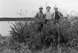 | 今旅行初の旅館の朝は曇だった。 朝食はあまり特色のないものであったが我々の旅行では何でも食べるので皆良く食べた。 水島は昨日の悲しい顔もどこへやら。 まったく愉快な顔をして無心に食べている。 トイレは新築の駅の水洗をつかうこととして9時過ぎに関乃屋を出る。 ( 41年後の関乃屋 http://www.noheji.or.jp/ryokan/sekinoya.htm) 駅へ行くとすぐに飛びこんだが満員。 新聞を読んで待つこととする。 升谷は我輩より生理的要求が強かったと見え、一人出てくるとすぐ飛び込んでしまった。 それがまた長いこと、長いこと。 その間に三沢行きのバスは入るし、バスの発車時間はせまる。 また生理的要求は強くなる。 そうしているところに彼は実に晴れ晴れとした顔をして出てくる。 発車5分前にようやく我輩は然るべきところには入れるが、時間がないので晴々としないままバスに乗る<時間切れ再試合>。 バスは大型であるが油くさい。 野辺地の町を通りやがて郊外へ。 低い丘々が続きススキの穂が冷たい風に揺れている。 空気はきれいで澄んでいてもなにか灰色のガスを通して眺めているような感じだ。 途中、道路に小型トラックが横転していて、かすかに東京を思い出させる。 バスは、ますます灰色の世界へ進む。 淋代入口と言うところはまったく名の通り淋しいところだ。 でも時々サイロを持った家が見えてくると牛や馬も見える。 今では牛や馬でもなつかしい。 灰色の中に生命が見られるからだ。 この辺は全然訪れる人もないと見え、観光客の姿など見ようにも見えない。 それにつけても高校全入等と要求している人々はこの現状を知っているのか。 この開拓地の想像以上の厳しい生活を。 学校はこのところ休みらしいが、冬などいかにして学校にたどり着くのだろうか。 ちょっと考え込んでいる間に、バスは右に田茂木湖が見えるところに来た。 この辺で降りよう、と皆張り切るのだがバスストップがないのでやむを得ず次の停留所でおりる。 土地のオバサンに展望台への道を問うもわからない。 とにかくその辺の道を入ってみるがついに湖畔に達するを得ず。 牛の骨のあるところで栗をとりながらジェット機の飛び交うのを見る。 とにかく低空を飛ぶのとスピードがあるので音の方向を見たのでは間に合わない。 またもとのバス道路に戻って十分くらい歩き湖畔にようやくたどりついたが、釣りなどとても出来そうにない遠浅である。 学校のグランドでカンパンの昼食をすませウロウロしてキャンデーを食べたり、10円のジュースを飲んでバスに乗った。 2時10分、倉内に着いたがどうも予定通りには行かない。 まず、水を得るのに一苦労。 小川原湖も遠浅でついにつりは出来ず。 土地の老人たちの言葉は殆どわからないが、沼崎への定期船が朝6時過ぎに出ることがわかる。 許可を得て、ワラの上にテントを張り5時前には夕食を済ます。 水島提供のオモシロイ本を読んだり、唄ったりして、二人の顔を見るともう目をつむっているので、仕方なく我輩も寝る。 [ 追 ] 倉内を我々が訪れたことは、僕にとって全く大きな意味を持つ。 今までの旅でこれほど言葉に苦労し、宿に苦労したことも珍しい。 それに夜、テントの外できびしい寒さを感じながらも唄いながら見た星空は、星の数こそ少なかったが実に印象的であった。 カモの飛ぶのも初めて見るような気がする。 倉内は今日も静かだろう。 もう一度秋に行きたい。 |