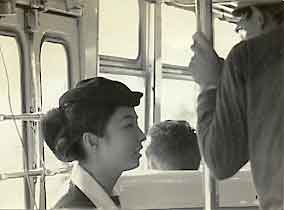 | 5時30分、襖ごしにおねえさん達がドシドシ歩くので何となく目覚め、水島の”ナニ”で完全に起きてしまった。 晴である。 さすがに冷えるが早速着がえて升谷と朝もやに煙る湖面に目をやる。 静まり返ったすがすがしさは日中の混雑など想像だにさせない程だ。 服部は昨夜からの読書にふけるし、水島は知らぬ顔して動かず。 ガバッとはね起きた大原は自分でけっ飛ばした丹前を拾い上げるや ”夜中に升谷が引っ張った”というが相手にされない。 7時30分朝食。 昨晩でこりて飯は洗面器様の容器にうんと持って来た。 ”金がないから残りをむすびにしてくれ”と平気なもんである。 これが貴重な昼食だけど塩くらいつけてくれただろうか。 9時30分子の口出発。 3時間ほど奥入瀬の渓流に沿って下った。 ジロジロ、ブラブラ、テクること10km余り。 例のむすびを1個と5分の3個ずつ食い、相変わらずバスに手をふりゃ高校生野郎は帽子を振るし、オバさんはニッコリこたえる。<娘さんはニッコリして手を振る> 大原、しっかりしようぜ!! でもわずかに紅葉した原始林の緑とひんやりした香りは我々の心を充分に包んで余りあるものであった。 行き合うメッチェンはともかく、同じ目つきの若者達や、砂ホコリを舞い上げる車族がいなかったらもっともっとよかたろうに・・・・・。 途中足が痛いと言い出す奴が出て、一同これには困ったが仕方なくペースを落とす。 いく度となくかけたモーション空しく一路焼山へのハイキングであった。 焼山からバス。 またまた原始林とその奥に深く沈むいくつかの湖を車窓に酸ヶ湯<蔦温泉>を過ぎる。 車中に青森の女の子数人。 一口に青森の子といってもいささかいろいろございました。 大原をびっくりさせる相当・・のもいるし、ほんのちょっとかわいい子もいて水島思わず鼻の下に手を当て横目でチラッ!(かわいいのは素直にのぞいているひざ小僧でした) 酸ヶ湯をちょっと過ぎる頃から紅葉は一層美しくなった。 無心に彩りを競いやがて消え行くのもあと数日だろう。 升谷がくやしがること、くやしがること。 一人でモソモソ落ち着かず、ついに下車しようと言い出した。 アア・・とか、ウンとか気のない返事。 だってヒザ小僧の女の子も気になるし、サトーさんも素敵でしたから。 その彼女と升谷が話をしている。 面白くないが一枚サービス。 パチリ。 写ってなくてもかまわないと思っている中、八甲田のふもと(?)で下車させられ、ここで一枚彼に撮らせる。 この写真がせめてものなぐさみだ。 つべこべ云わずに焼き付けてくれ。 彼女の横顔が良かった。 ピチッと切れた瞳にはひかえめなやさしさと東京に少ない何かがあったよ。 哀れなドンファン達、彼女を余り困らせるなよ。 我を忘れて友情まで失うことなかれ! 名言だが考えてみると世の中にはつまらない男はうじゃうじゃいて、我々よりつまらぬ男もまたうじゃうじゃいて、ぞろぞろ十和田へやって来て、彼女のバスに乗る。 現実的な男共の前に大自然の力など一瞬無力となるから数え切れぬ視線が彼女に注がれて、皆勝手なことを考えて、・・・・・・・・・。結局遠慮はいらないんだ。 しっかりやろうぜ。 <彼女の力でつまらない男も立派になると思います> 気の向くままに付近を1時間余り散歩。 服部持参の東京のカンズメをジャンケンで食う。 すぐ前には青森の高校生パーティの明るい若々しさがいっぱい。 つい数日前の如く思われる過ぎし日の自分の姿を見、その雰囲気に引き込まれ、うかつにも写真16枚を送る約束をする。 ふと気付くと太陽は低い夕雲にかくれ、秋の冷気が駆け足で迫ってくる。 思わずジャンパーの襟を立て立ち上がる。 厚生省直営のトイレに寄ってそろそろ帰ろう。 さすがに疲れたか皆おとなしくバスに揺られている。 ガイドも何も云わず青森駅へ。 暮れ行く窓外には貧しいまでに素朴な生活が我々に何かを語りかける。 黙々と繰り返されてきたこの人たちの毎日にはどんな喜びと幸福があったのかな。 それは我々の環境と経験では理解しがたいものだろう。 18:00 急行津軽にどうやら落ち着く。 土産も買ってホッとするや、とたんに空腹感が押し寄せる。 むずび1ヶで良く頑張ったものだ。 30円、5円と残金の計算に余計気がめいる。 あまりみっともないこと云うなよ。 隣りは生意気な高校生だぜ。 停車する度に水島、大原が反射的に飛び出すも弁当にありつけず。 秋田でやっと食う。 服部のわきに来た東北の人らしき若き女性。 ”どこまで行くの?” ”ボソボソ・・・・・”、 ”近いの?” ”・・・・近くない・・・・・”、”荷物棚にのせる?” ”ブツ、ブツ・・・・”、モジモジ。 残念でした。 彼女はハンカチを顔に寝たふりをする。 荷物でひざを隠しながら。 <田中はその娘の前で顔を赤らめる!> ああ、あと十四、五時間、とてもじゃないけど日記なんか書けないよ。 後日忘れぬうちに書くとして、マヒ寸前の頭を休ませてくれ。 車内は適当なスチーム。 升谷の鼻がま
